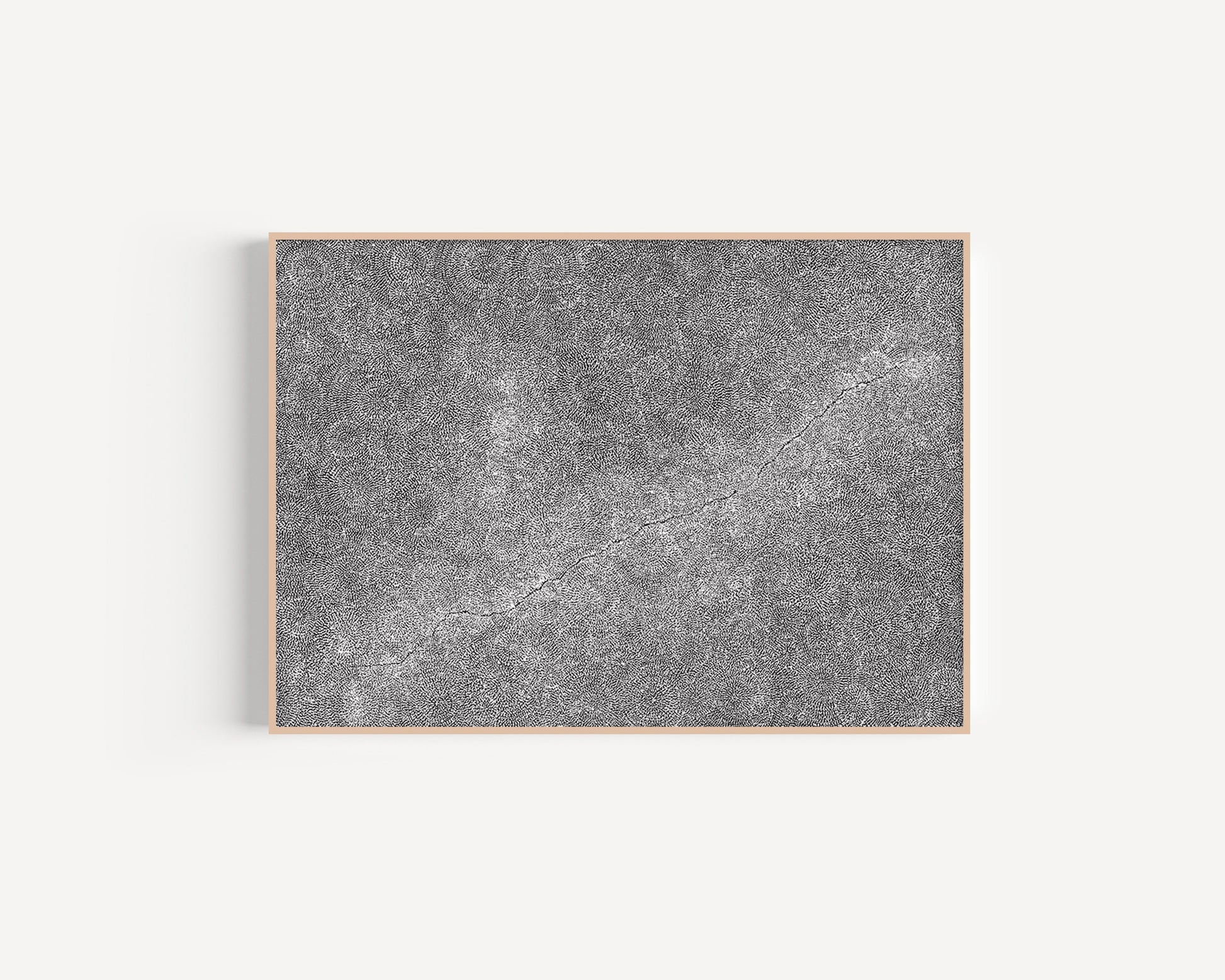 The stretched canvas sits inside a slim timber frame with a small shadow gap between the artwork and the frame edges — creating a “floating” appearance.