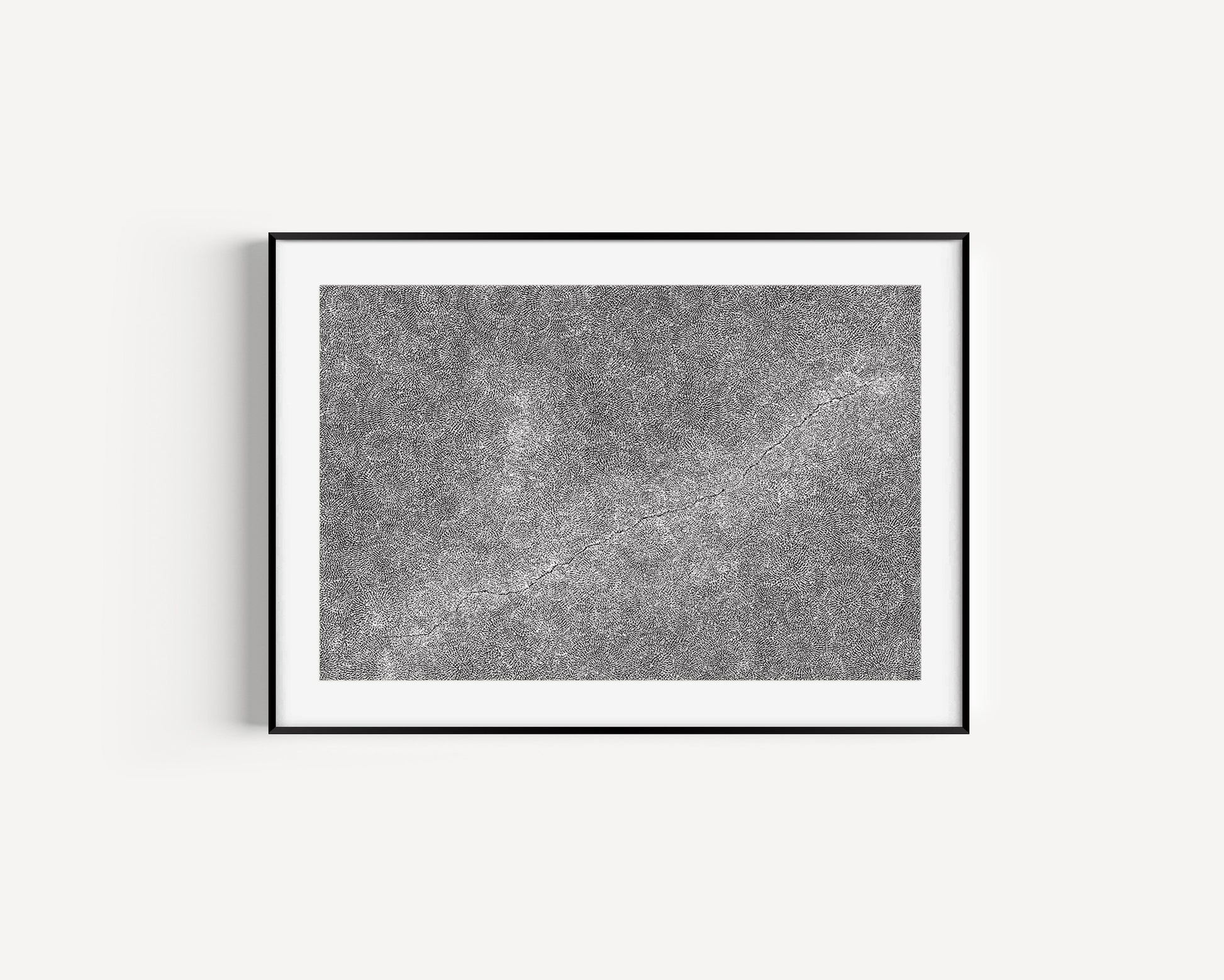 Drawing on the teachings of her influential father, Tarisse recalls the philosophy he taught her – that everything in life is circular. There is no beginning and no end. Unlike her sister, Sarrita who paints the same thematic in thick textured paint, Tarisse uses thin, flat paint sticking within the tonal variations of one colour. She creates a refined and sophisticated look and the colours of yellow, pink or blue construct a modern design. The repetition of the circle across the canvas refers to her father’s philosophy but is completed with such preciseness that it aesthetically resembles the accuracy of a print.
