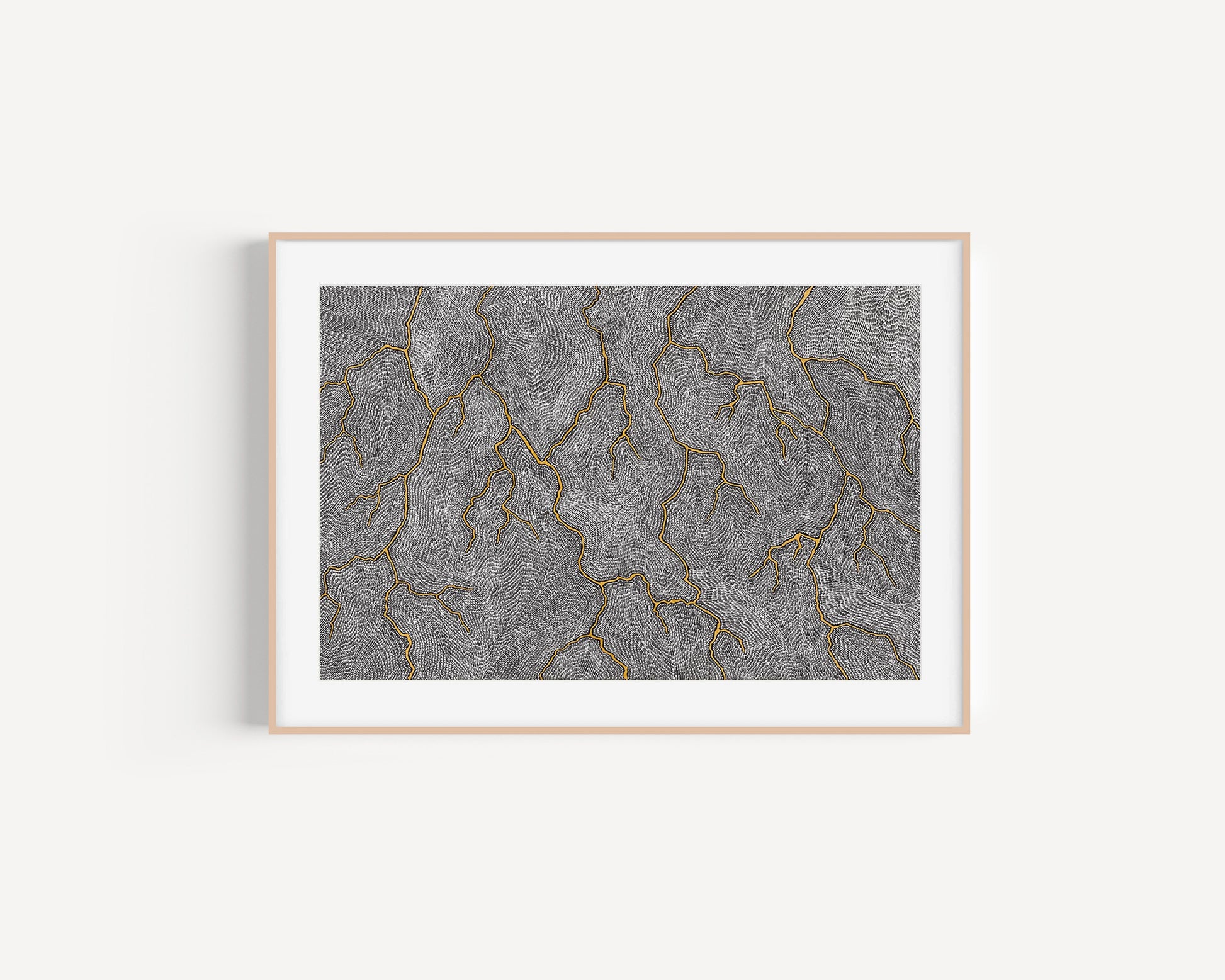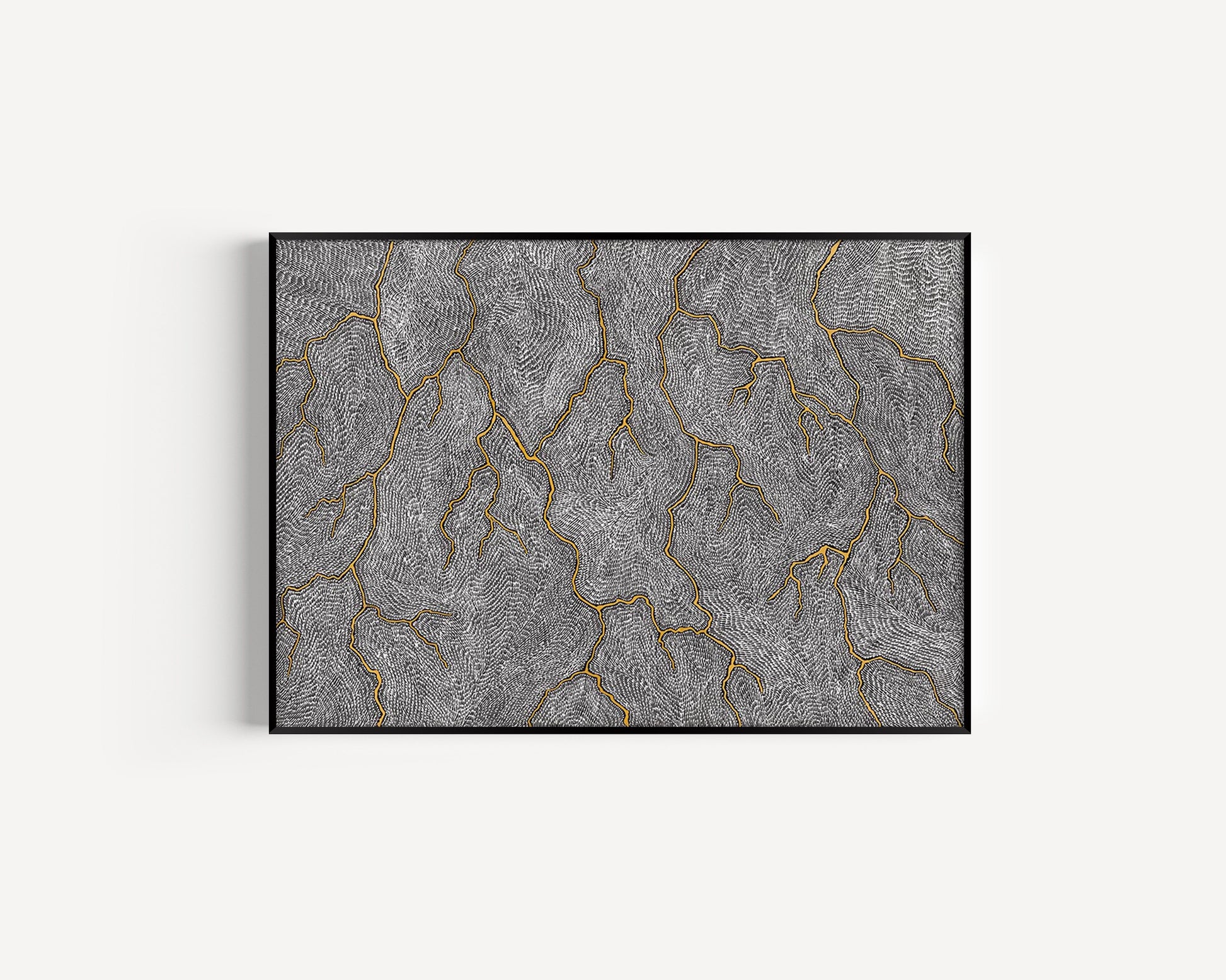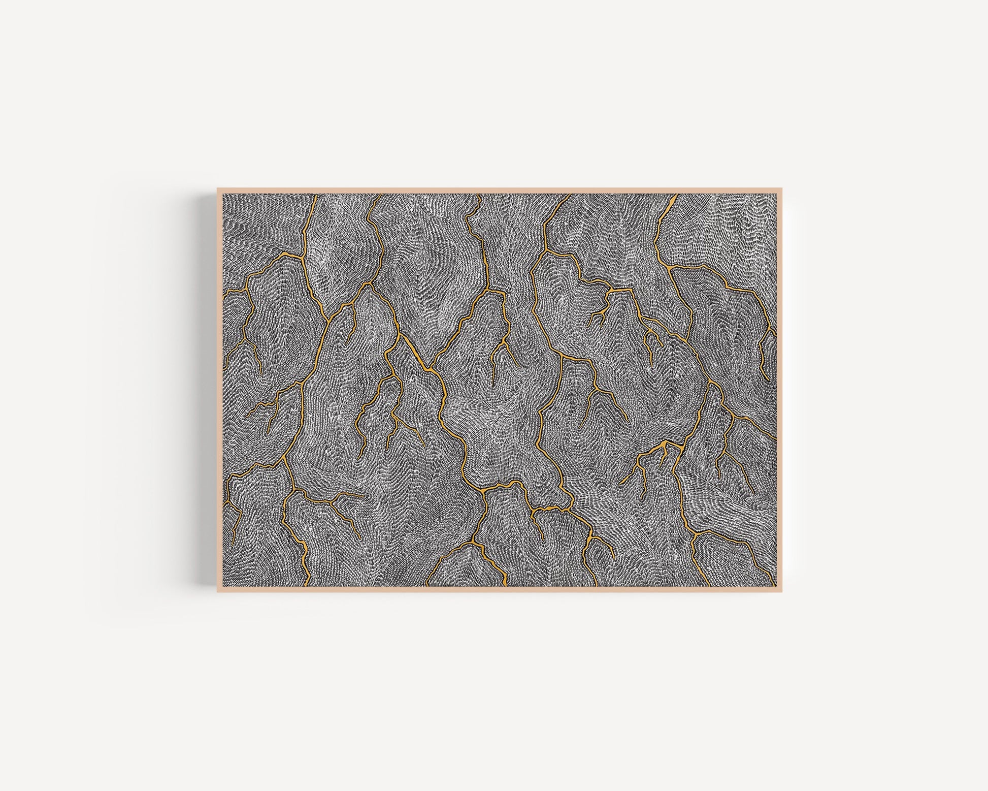 The stretched canvas sits inside a slim timber frame with a small shadow gap between the artwork and the frame edges — creating a “floating” appearance.