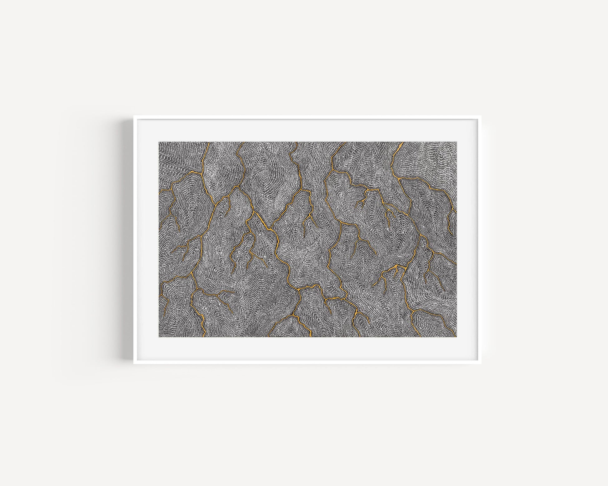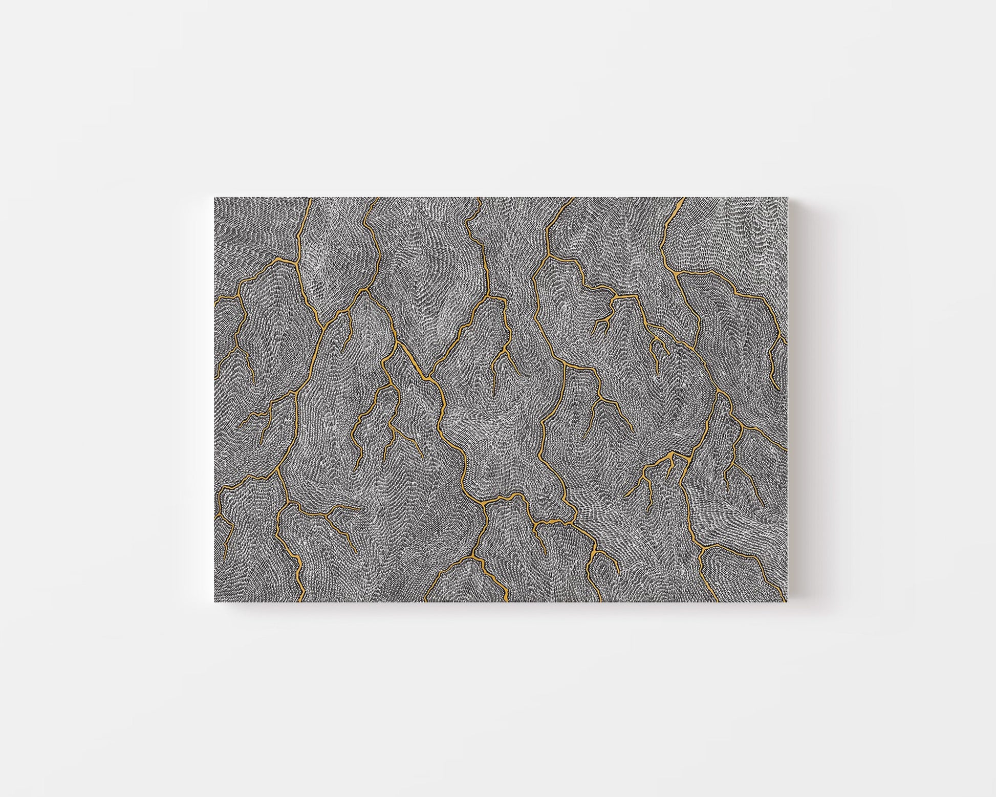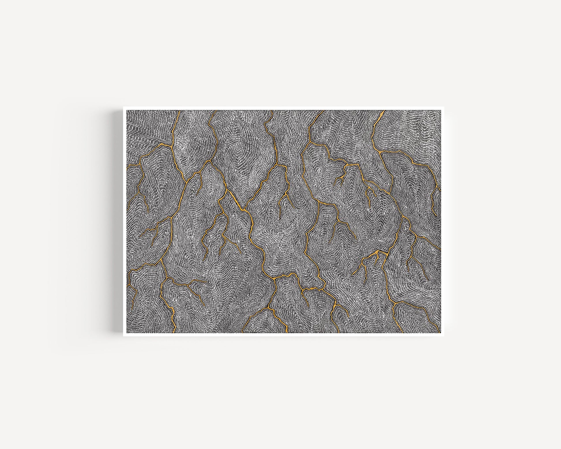 Sarrita’s Lightning paintings are a painted memory of the electrical storms in the tropical climate of Darwin where Sarrita spent her youth. The lightning would crack across the entire sky, creating lines not dissimilar to cracked earth. And with the lightning came the winds that in their fury whipped up all the dust, rain, heat and magnetic energy into a maelstrom in the air. Sarrita would discover new patterns and colours every time she witnessed these natural light shows.