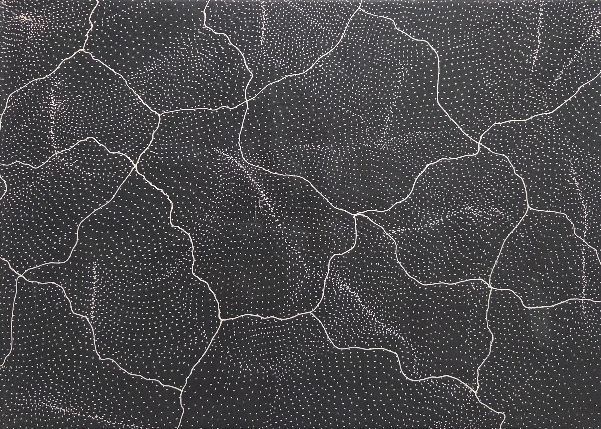 Sarrita’s Lightning paintings are a painted memory of the electrical storms in the tropical climate of Darwin where Sarrita spent her youth.  The lightning would crack across the entire sky, creating lines not dissimilar to cracked earth.  And with the lightning came the winds that in their fury whipped up all the dust, rain, heat and magnetic energy into a maelstrom in the air.  Sarrita would discover new patterns and colours every time she witnessed these natural light shows.
