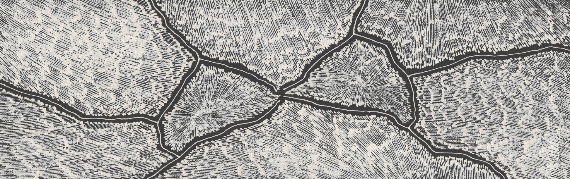 Sarrita’s Lightning paintings are a painted memory of the electrical storms in the tropical climate of Darwin where Sarrita spent her youth. The lightning would crack across the entire sky, creating lines not dissimilar to cracked earth. And with the lightning came the winds that in their fury whipped up all the dust, rain, heat and magnetic energy into a maelstrom in the air. Sarrita would discover new patterns and colours every time she witnessed these natural light shows.