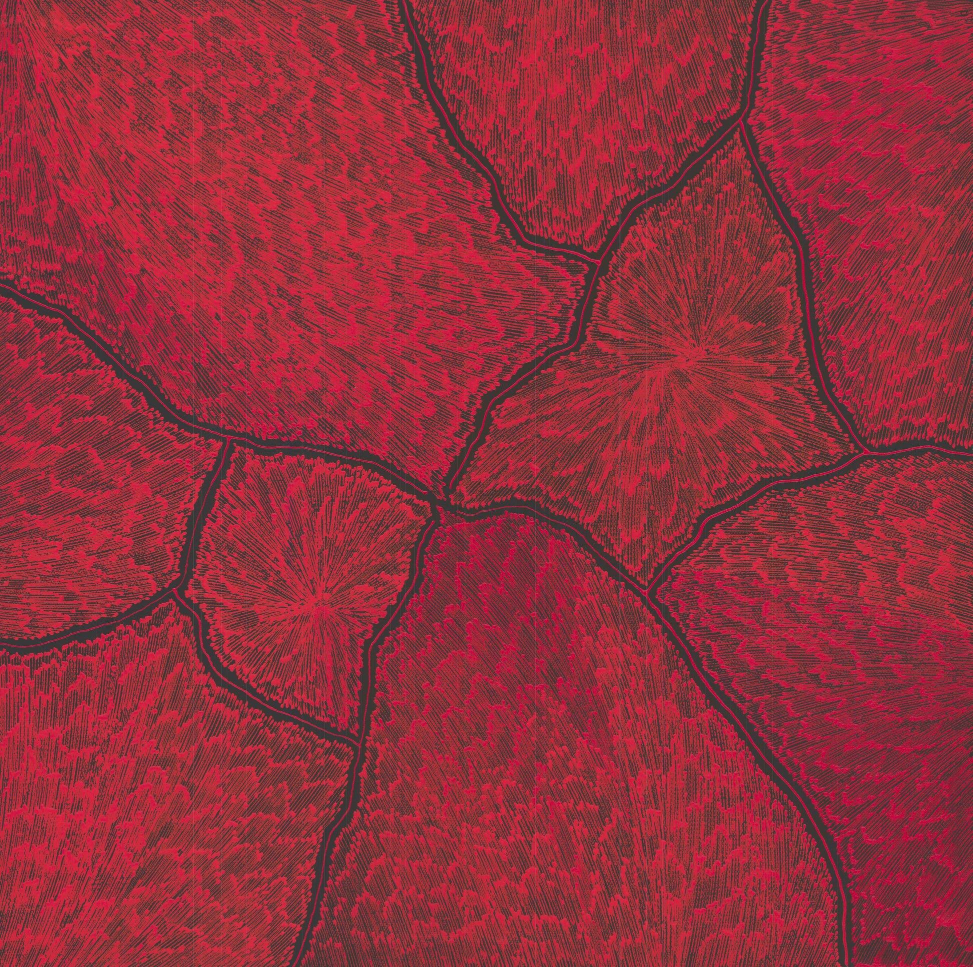 Sarrita’s Lightning paintings are a painted memory of the electrical storms in the tropical climate of Darwin where Sarrita spent her youth. The lightning would crack across the entire sky, creating lines not dissimilar to cracked earth. And with the lightning came the winds that in their fury whipped up all the dust, rain, heat and magnetic energy into a maelstrom in the air. Sarrita would discover new patterns and colours every time she witnessed these natural light shows.