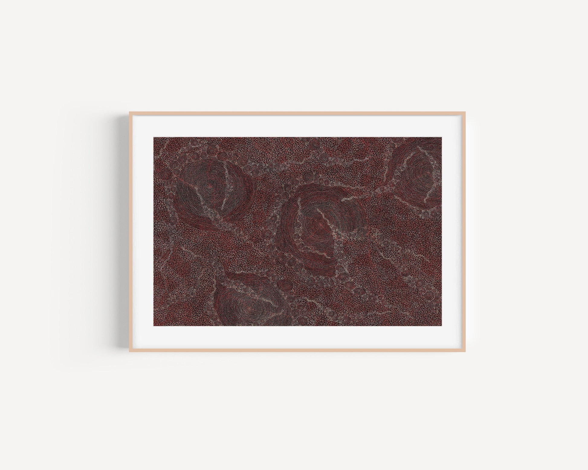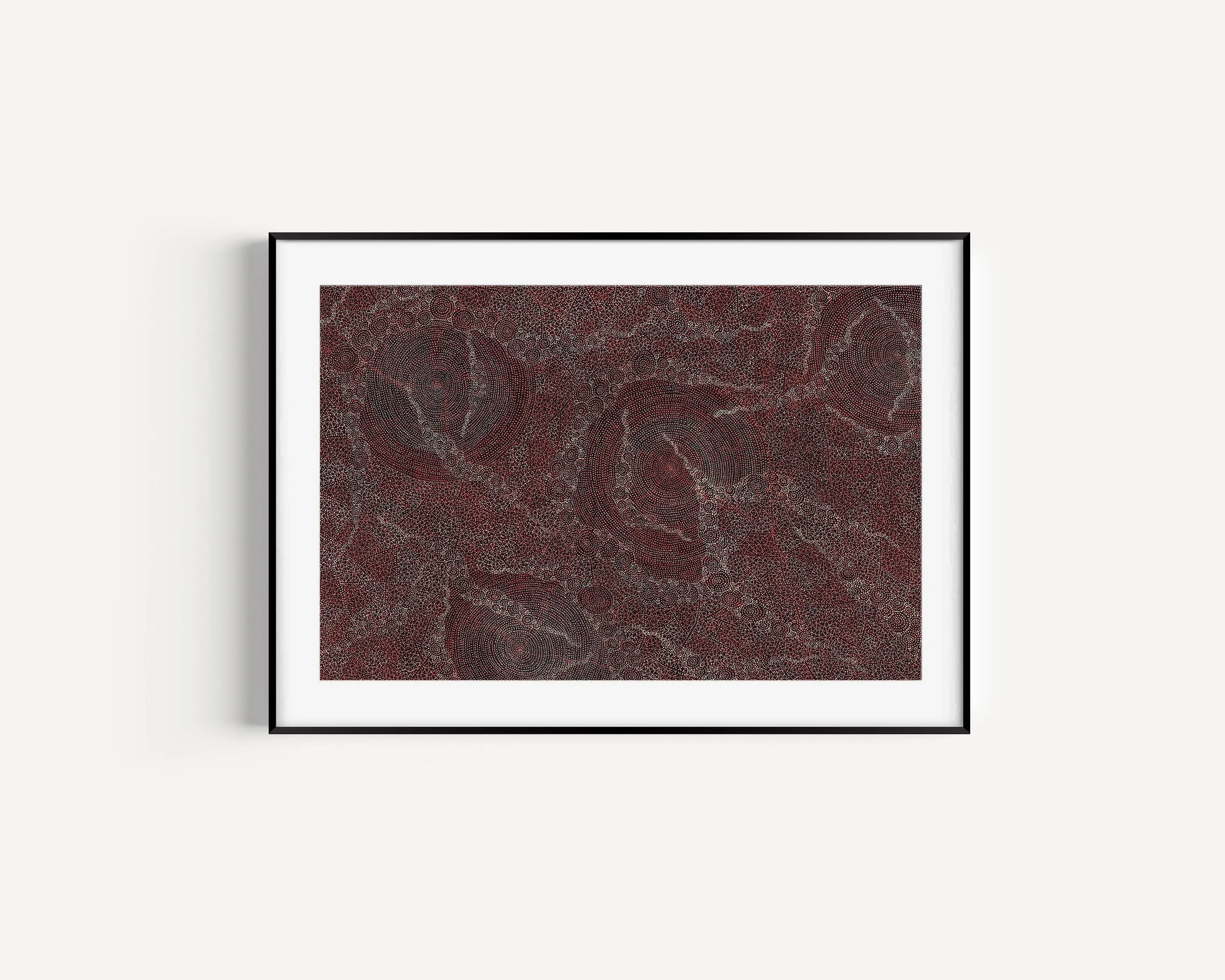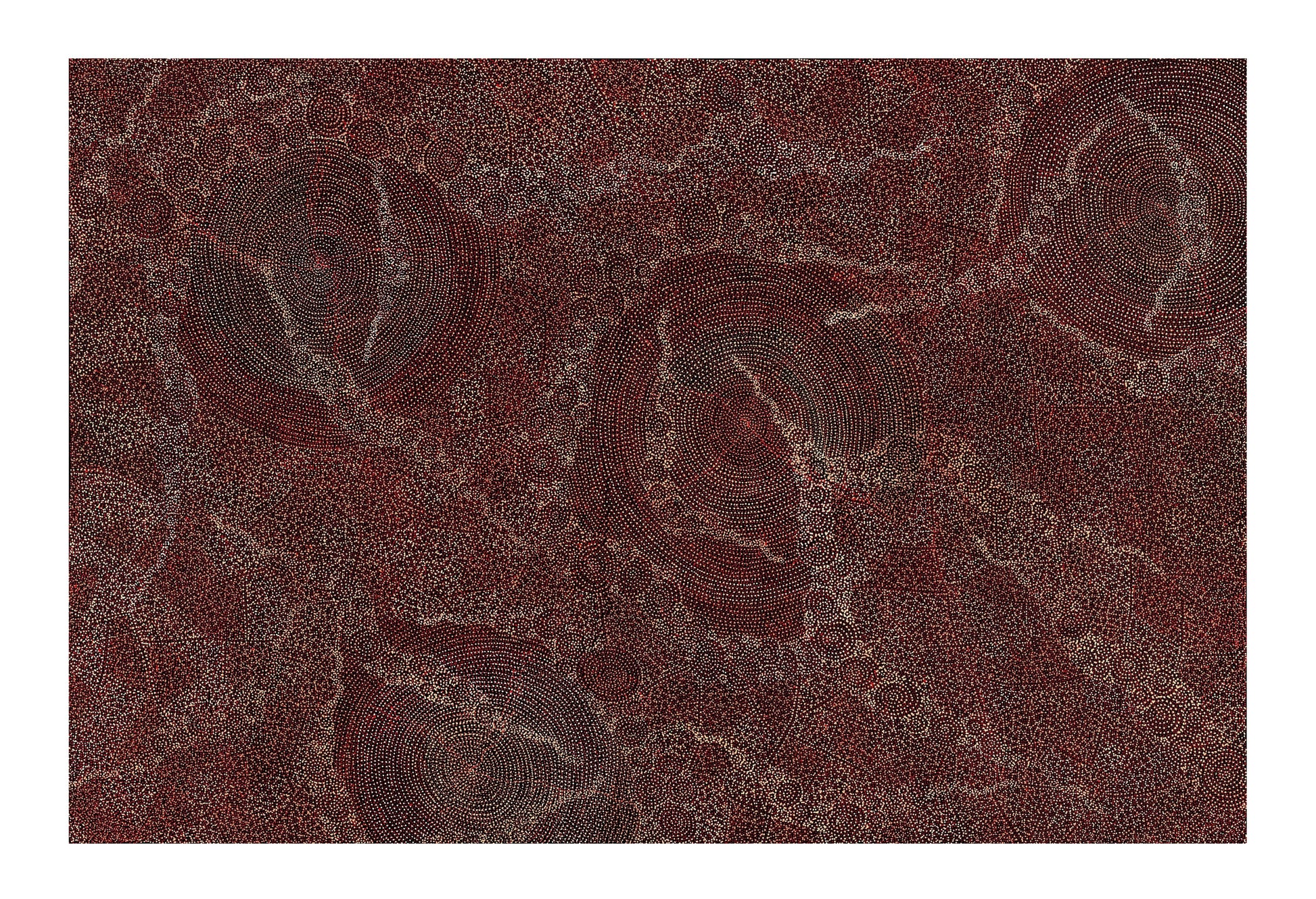 Sarrita shares the stories of her ancestors. painted in layers, the ancestors series focuses on those who have passed on, yet guide our path today. The ancestors layer in the dry season artworks is painted in rich reds and Vibrant yellows, mixIng to create patterns that shape the land layer. the land layer is painted in ochres and brings to life the dRying landscape cutting across the land, waterholes evaporating, shrinking and reaching out in hope of replenishment. The land is dry and cracking, leavIng behInd aNimal tracks and paths as nature seeks out the last reminiscence of life.
