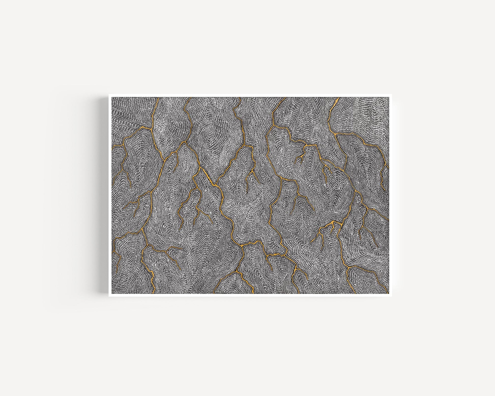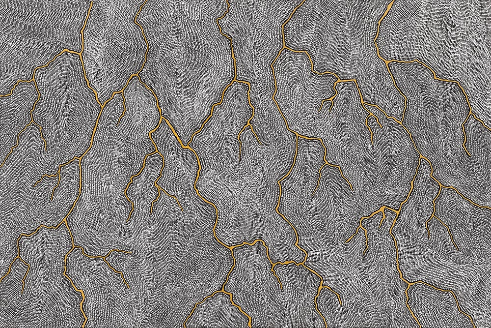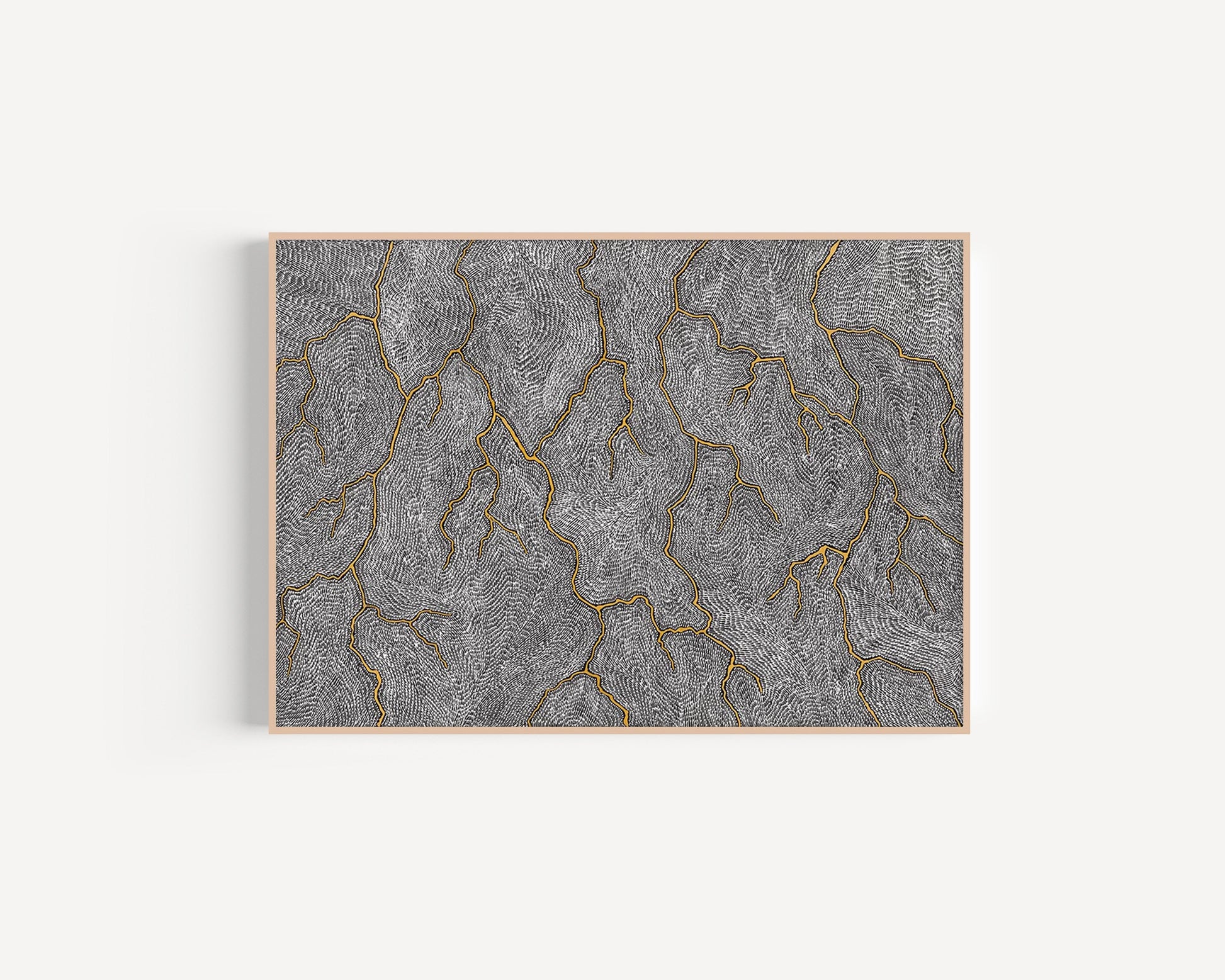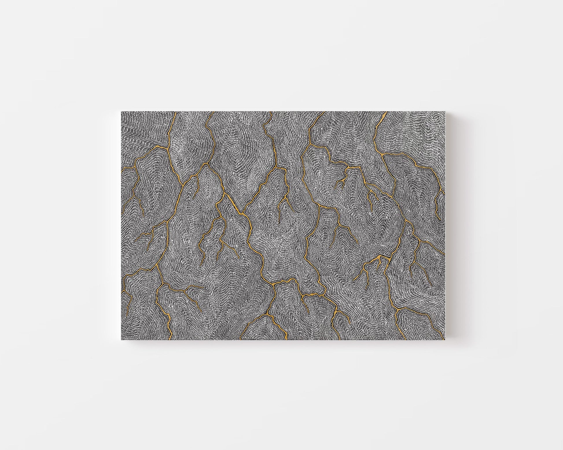 Sarrita’s Lightning paintings are a painted memory of the electrical storms in the tropical climate of Darwin where Sarrita spent her youth. The lightning would crack across the entire sky, creating lines not dissimilar to cracked earth.
