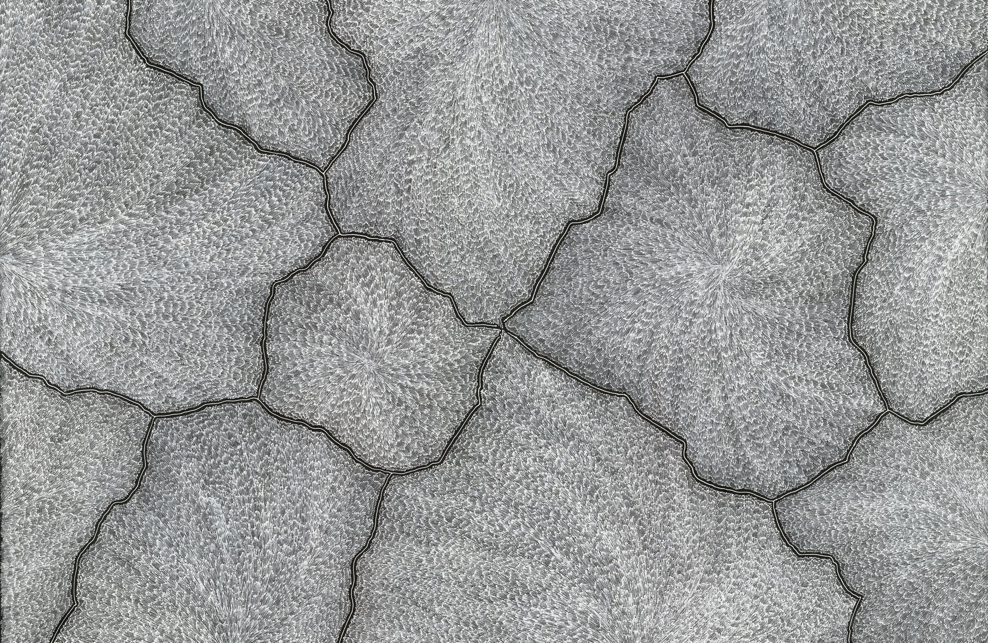 Sarrita’s Lightning paintings are a painted memory of the electrical storms in the tropical climate of Darwin where Sarrita spent her youth. The lightning would crack across the entire sky, creating lines not dissimilar to cracked earth. And with the lightning came the winds that in their fury whipped up all the dust, rain, heat and magnetic energy into a maelstrom in the air. Sarrita would discover new patterns and colours every time she witnessed these natural light shows.
