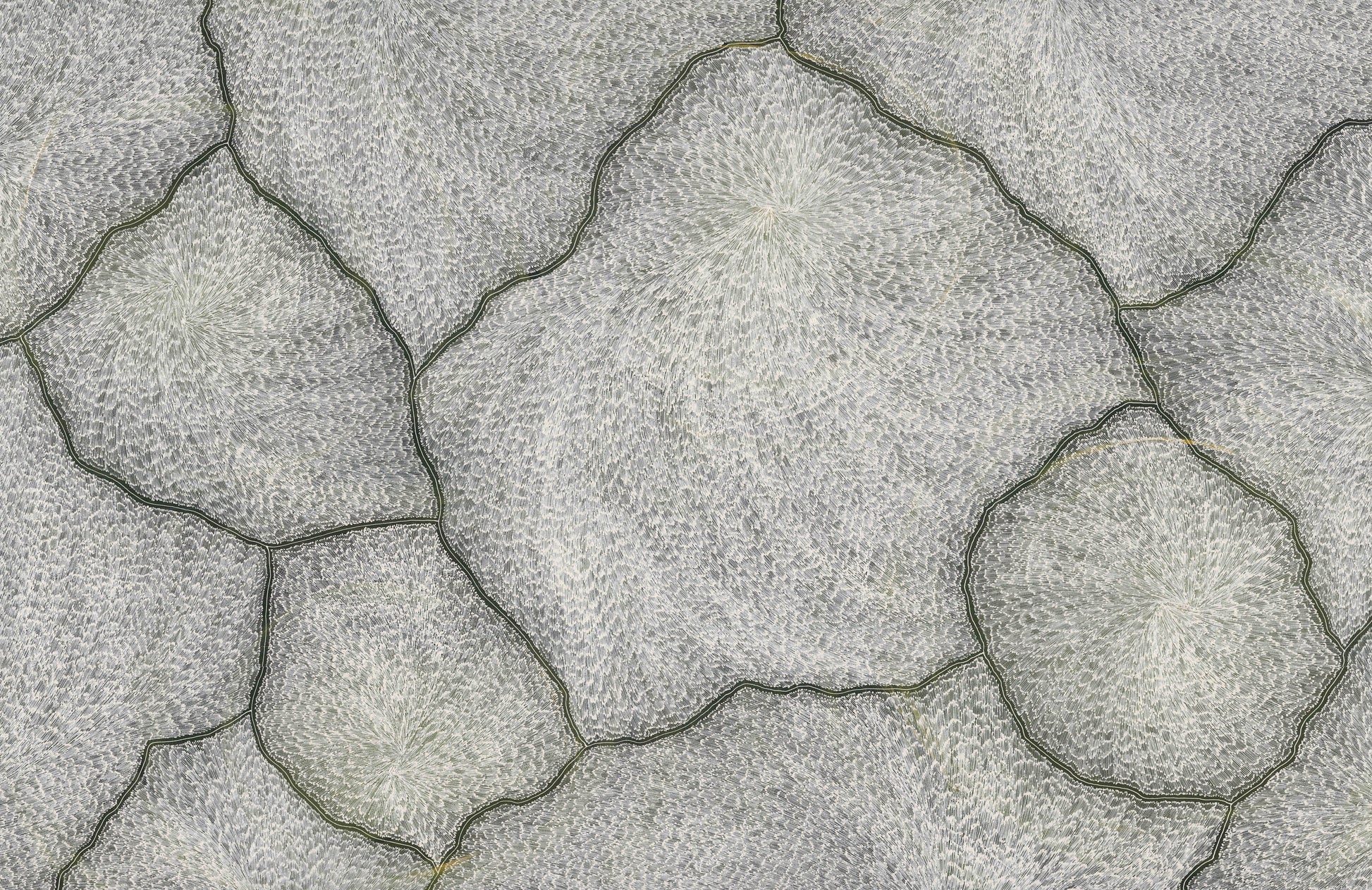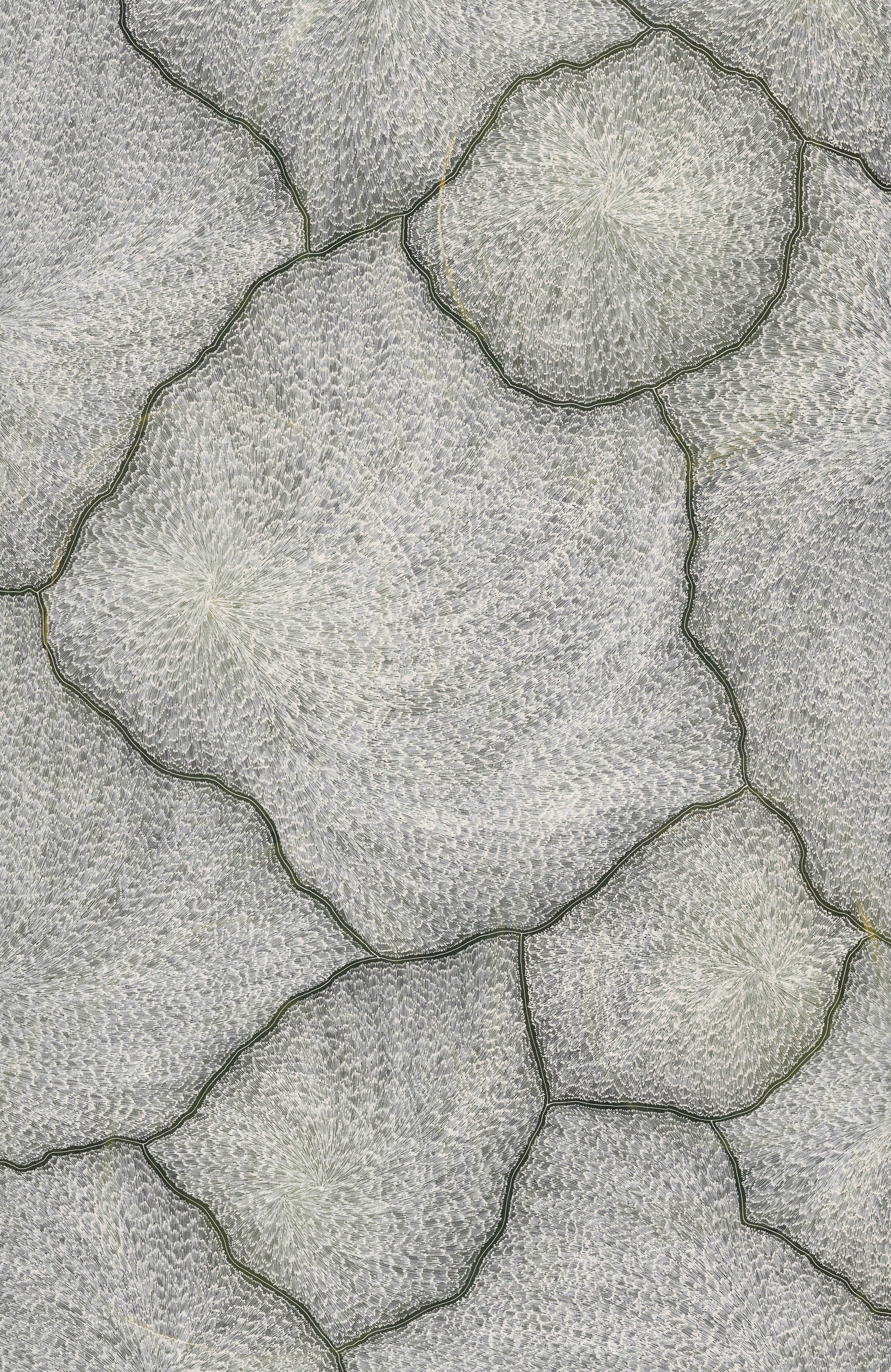 Sarrita’s Lightning paintings are a painted memory of the electrical storms in the tropical climate of Darwin where Sarrita spent her youth.  The lightning would crack across the entire sky, creating lines not dissimilar to cracked earth.  And with the lightning came the winds that in their fury whipped up all the dust, rain, heat and magnetic energy into a maelstrom in the air.  Sarrita would discover new patterns and colours every time she witnessed these natural light shows.