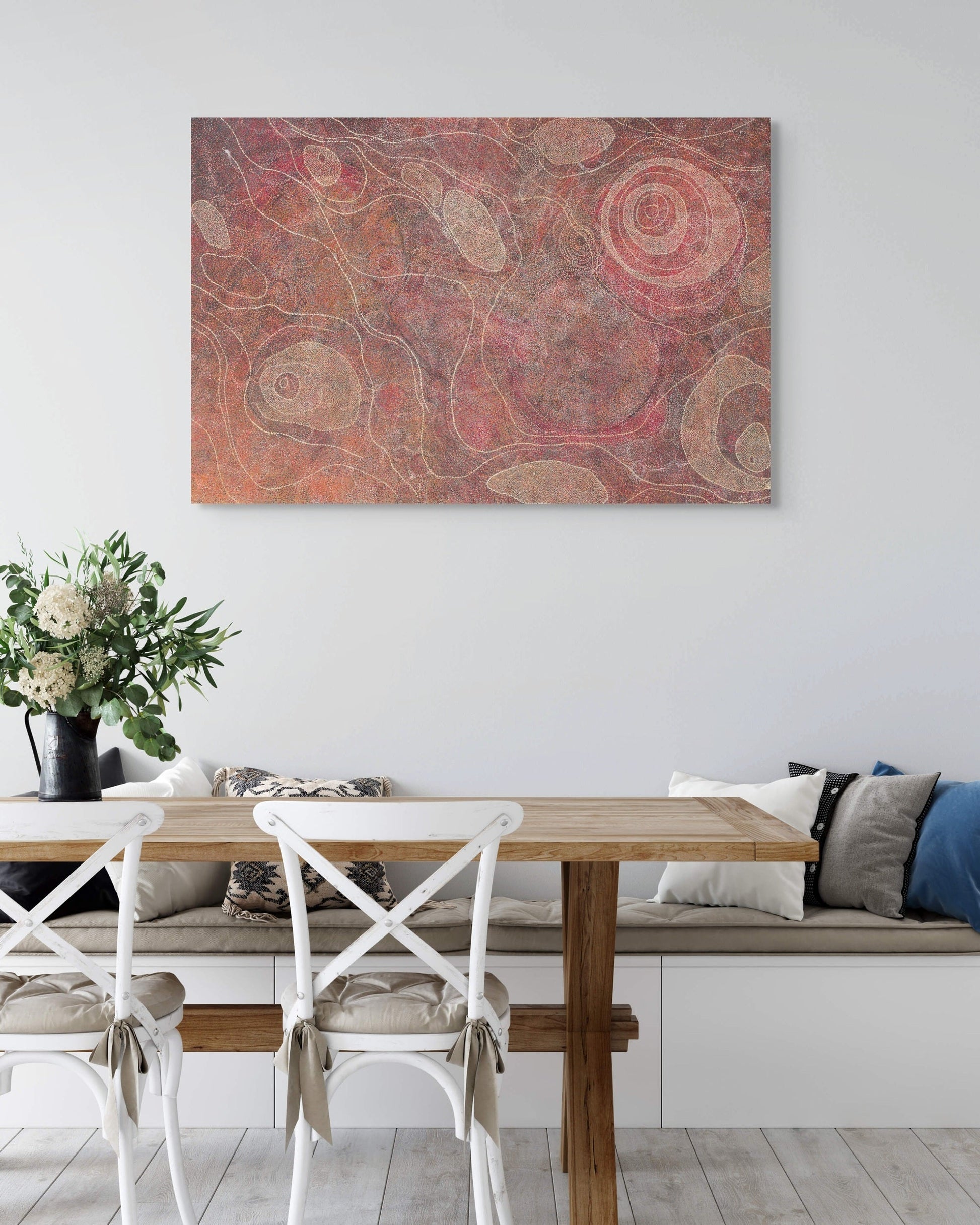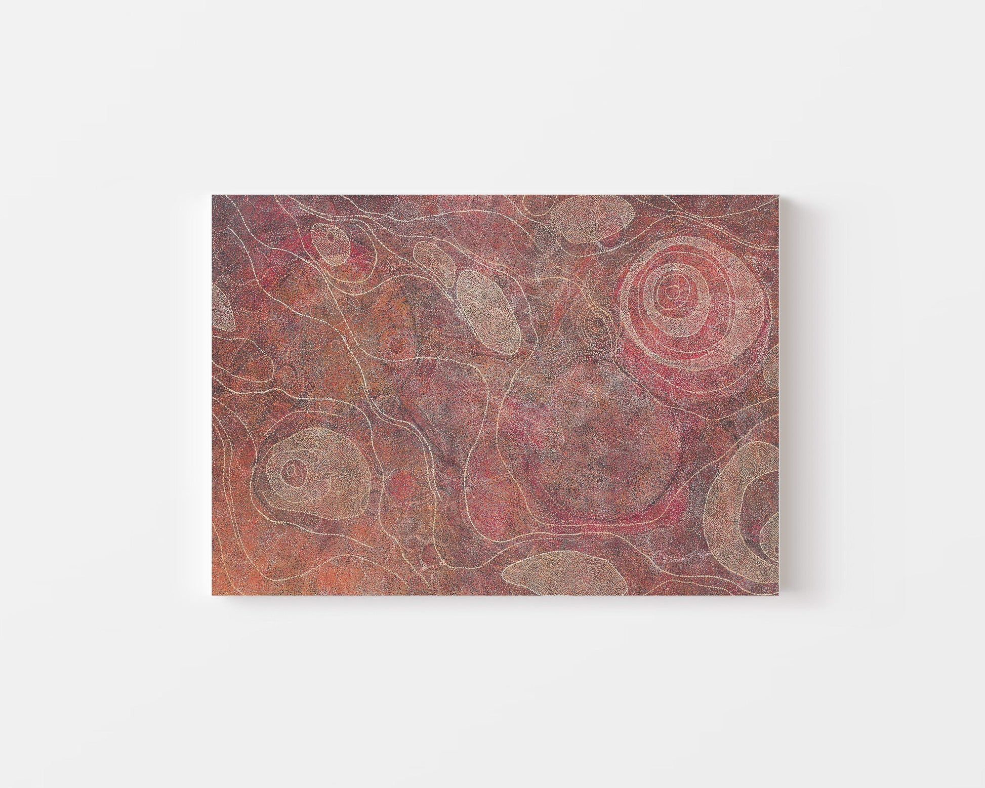 Stylistically minimal, Sarrita leaves a lot of the canvas absent of paint and simply traces fine lines across the canvas.  Undulating in their movement, they create a subtle hypnotic effect the viewer be drawn in to. Sarrita depicts these topographically which is a very common way of painting or ‘mapping the land’ amongst Central and Western Desert Aboriginal artists.