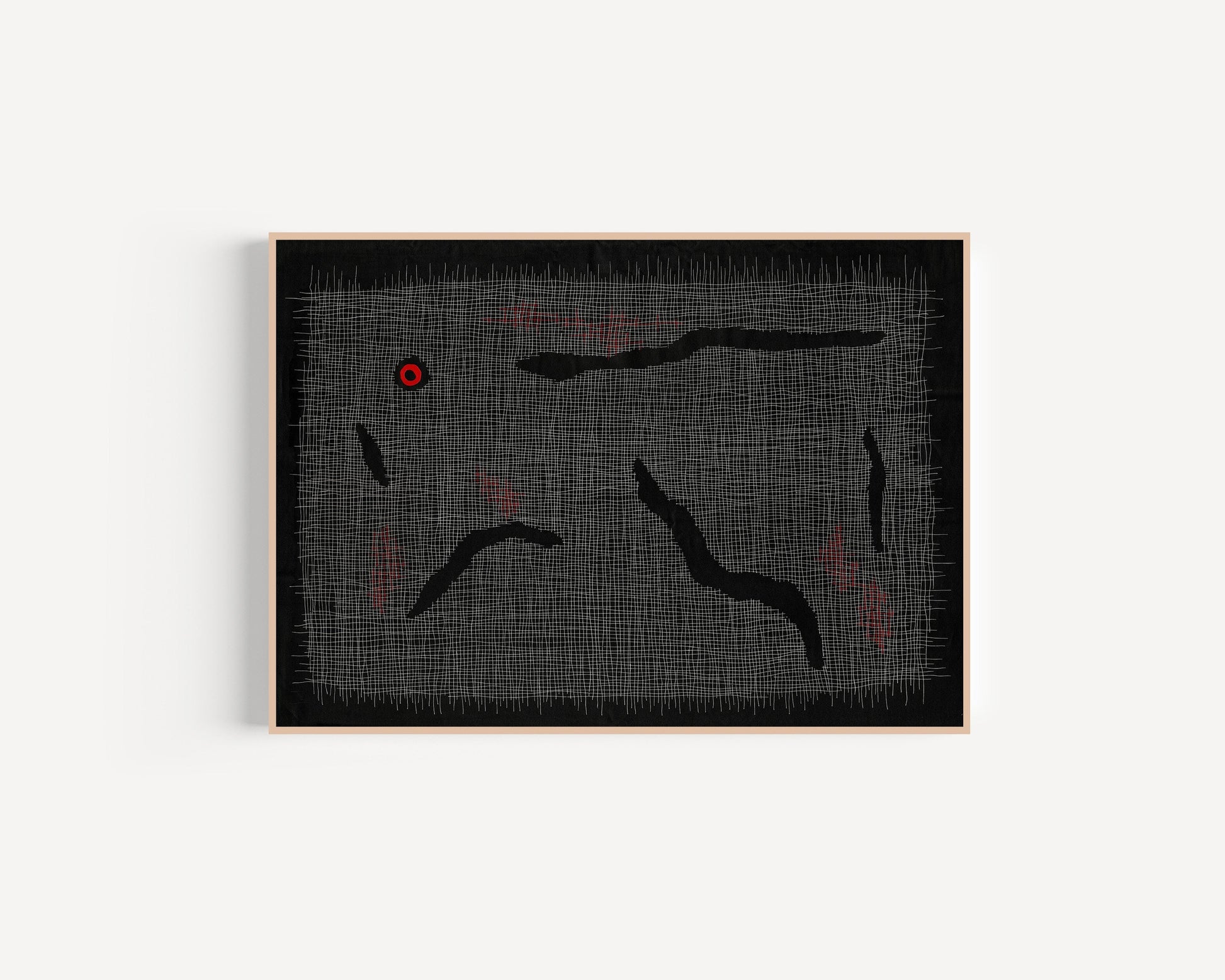 Our Land represents the beauty of country, the continuous lines of Ancestors, travel and connection. These lines are fading and obscured, but still present. The eye is drawn to the red of the circle, this is used to represent home, it will always call to us, and the land will always carry us home.