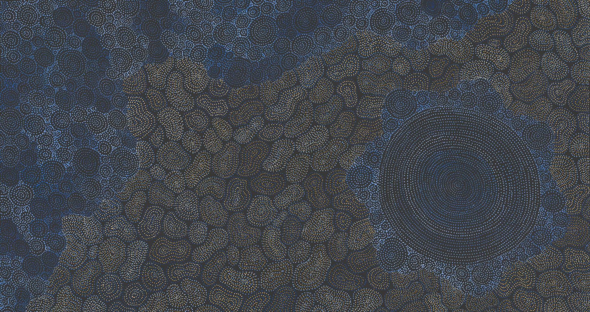 When Sarrita traveled to see the waterholes with her father she saw many of them dried up and this is what she paints. Represented by the concentric circles, the waterholes are fed by underground streams pushing through land and rock.  Sarrita shows these streams by ribbons of wavy lines intricately entwined across the canvas.